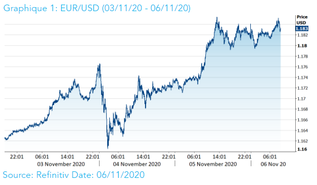 Les marchés attendent toujours la confirmation du résultat final de l’élection présidentielle américaine, même s’il semble que Joe Biden en ait fait assez pour obtenir les clés de la Maison Blanche. Certains états n’ont pas encore terminé le dépouillement, les candidats sont proches en Géorgie (un état incontournable pour Trump), Biden est légèrement en tête en Arizona et au Nevada et il comble l’écart en Pennsylvanie. La plupart des votes par correspondance qui n’ont pas encore été comptés devraient être pour les démocrates, les marchés semblent suffisamment confiant sur une victoire de Biden. Les cotes des bookmakers donnent désormais à Biden environ 90% de chances de victoire.