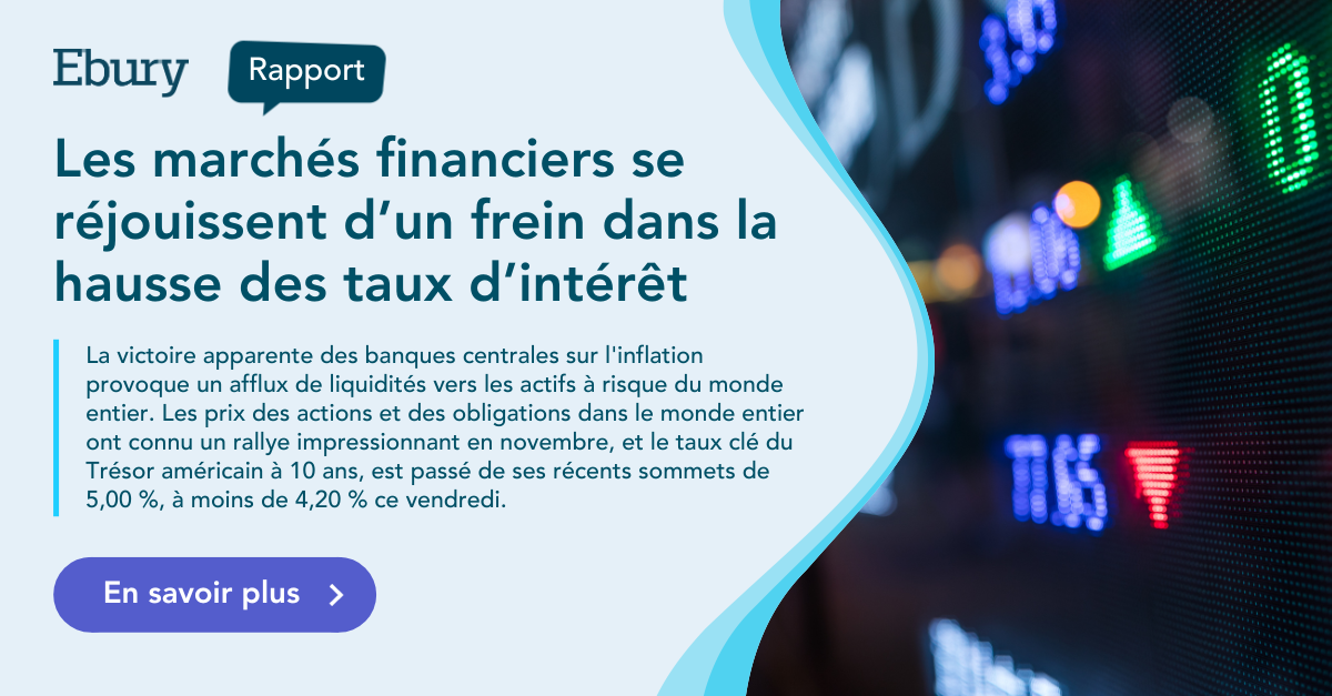 La victoire apparente des banques centrales sur l’inflation provoque un afflux de liquidités vers les actifs à risque du monde entier. Les prix des actions et des obligations dans le monde entier ont connu un rallye impressionnant en novembre, et le taux clé du Trésor américain à 10 ans, est passé de ses récents sommets de 5,00 %, à moins de 4,20 % ce vendredi.